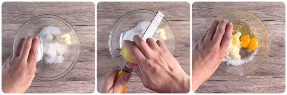 Lavorate velocemente il burro freddo con lo zucchero, un pizzico di sale, la buccia grattugiata del limone. Potete fare questa operazione anche usando un robot a lame.