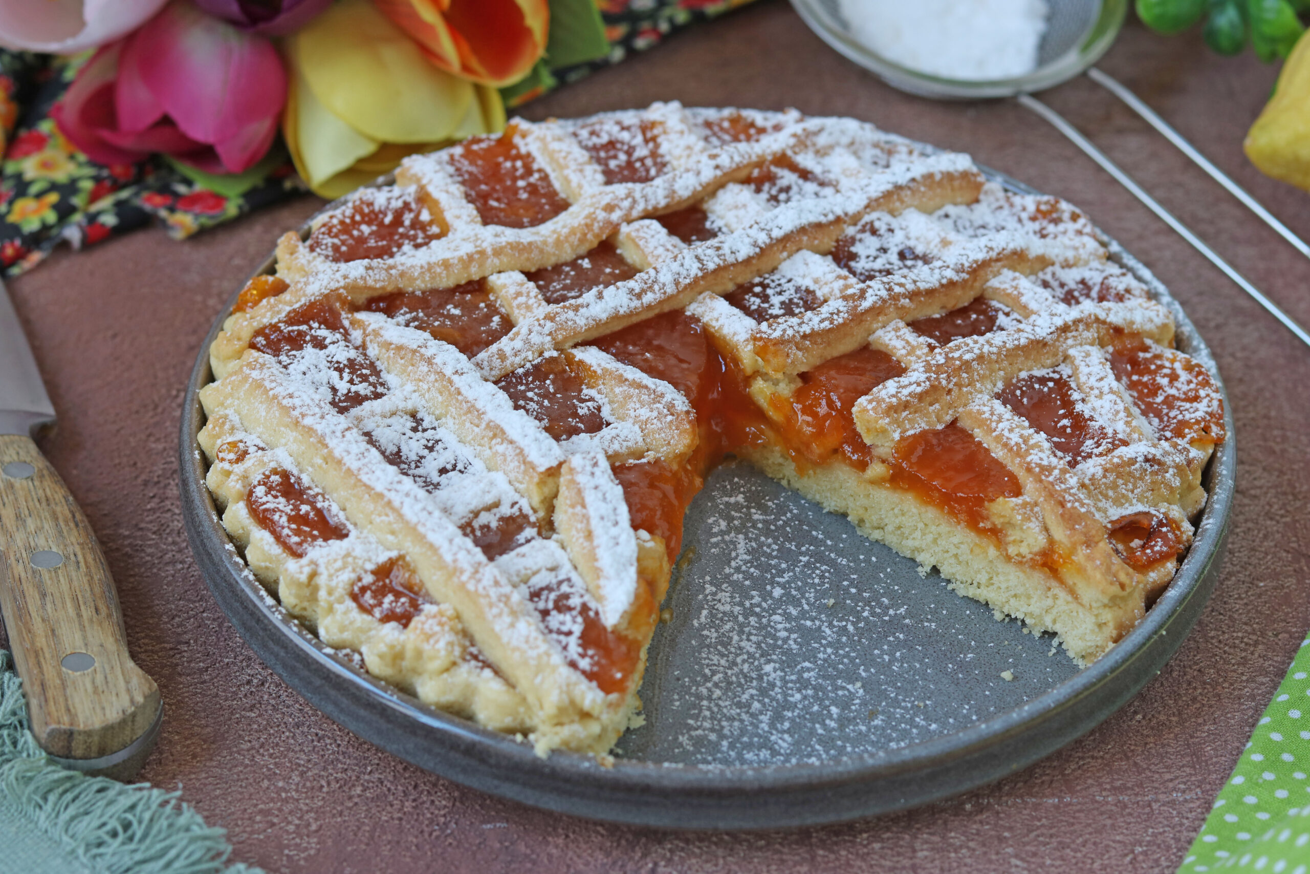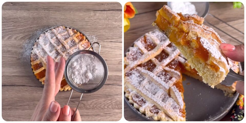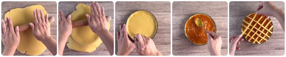 Riprendete la frolla, stendetela ad uno spessore di circa mezzo centimetro e mettetela sullo stampo imburrato e infarinato. Eliminate l’eccesso e bucherellate il fondo con i rebbi della forchetta. Mettete la confettura di albicocche e decorate la superficie con delle strisce ricavate dalla frolla avanzata.