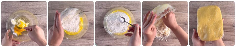 Aggiungete la farina, il lievito per dolci e mescolate fino a quando il composto inizia a legare. Trasferite sul piano di lavoro e formate un panetto, stendete e avvolgete nella pellicola trasparente. Mettete in frigo almeno mezz’ora.