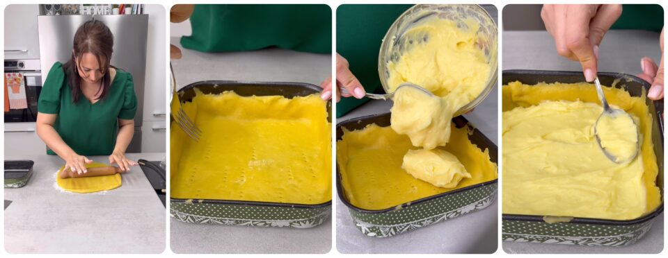 Stendete subito la frolla, non necessita di riposo in frigo e sistematela sul fondo dellostampo alzando i bordi. Bucherellate con i rebbi della forchetta e versate la crema pasticcera ormai fredda che avete preprato con la mia ricetta che trovate QUI. Livellate con un cucchiaio.