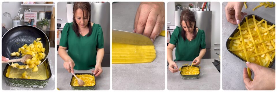 Versate le mele sulla crostata e con la frolla avanzata ricavate delle strisce e decorate la superficie.