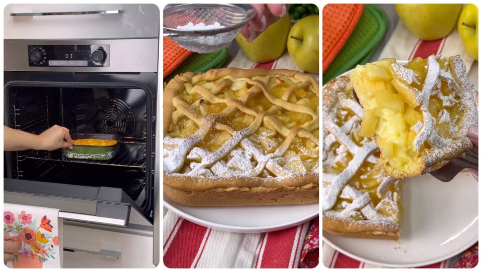 La crostata crema e mele è un grande classico della pasticceria casalinga, uno di quei dolci che sanno di famiglia e tradizione. La particolarità di questa versione è che sia la crema pasticcera che le mele vengono cotte direttamente con la frolla in forno, per un risultato compatto, profumato e irresistibile. Ogni morso regala la friabilità della pasta, la dolcezza della crema vellutata e il gusto unico delle mele che diventano morbide e leggermente caramellate durante la cottura.
