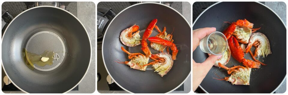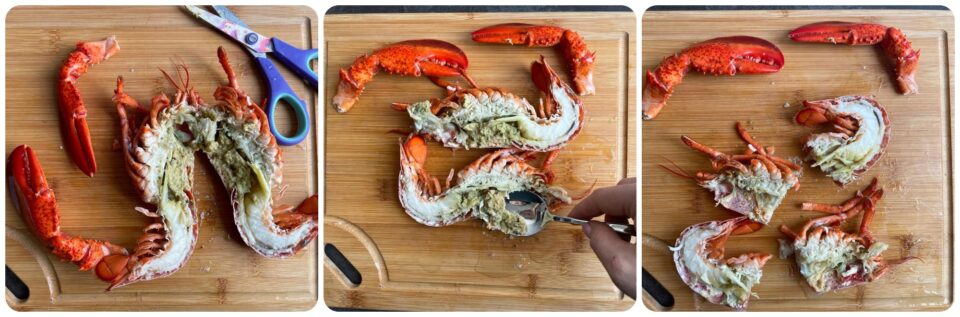 Per prima cosa dovrete aprire l’astice a metà, io l’ho fatto con delle forbici da cucina, quindi eliminare con un cucchiaio l’intestino e dividetelo in 4 pezzi.
