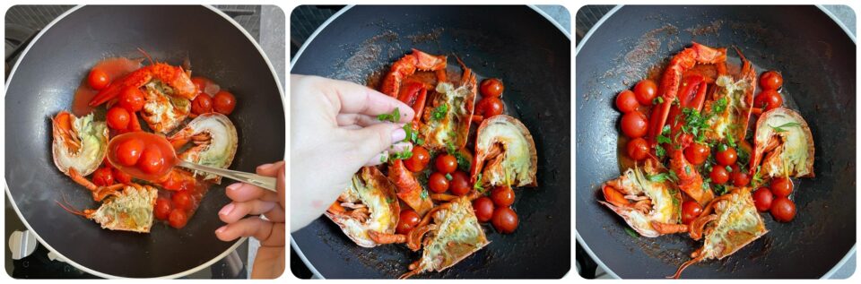 Aggiungete i pomodorini e fate cuocere una decina di minuti a fiamma vivace aggiungendo un goccio di olio, regolate di sale e spolverizzate con del prezzemolo fresco tritato.