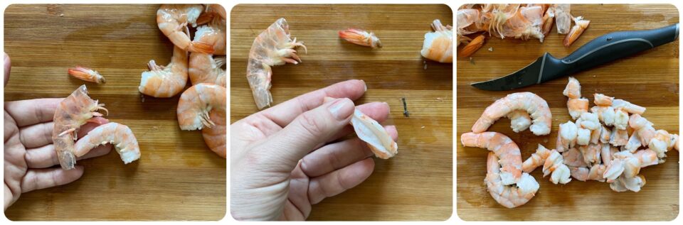 Adesso pulite i gamberi, quindi rimuovete il carapace e il filo intestinale, tagliateli grossolanamente lasciandone qualcuno intero per la decorazione dei piatti.