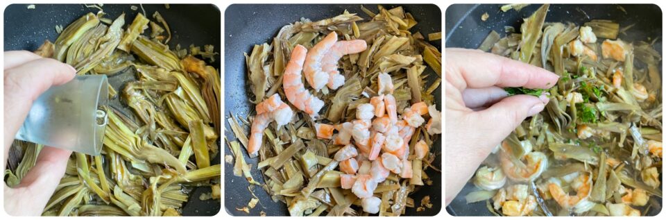 Quando i carciofi sono cotti, dopo circa 20 minuti, sfumate con il vino bianco, lasciate evaporare e aggiungete i gamberi. Fateli cuocere circa 3 minuti. Regolate di sale e aggiungete un goccio di olio a crudo.