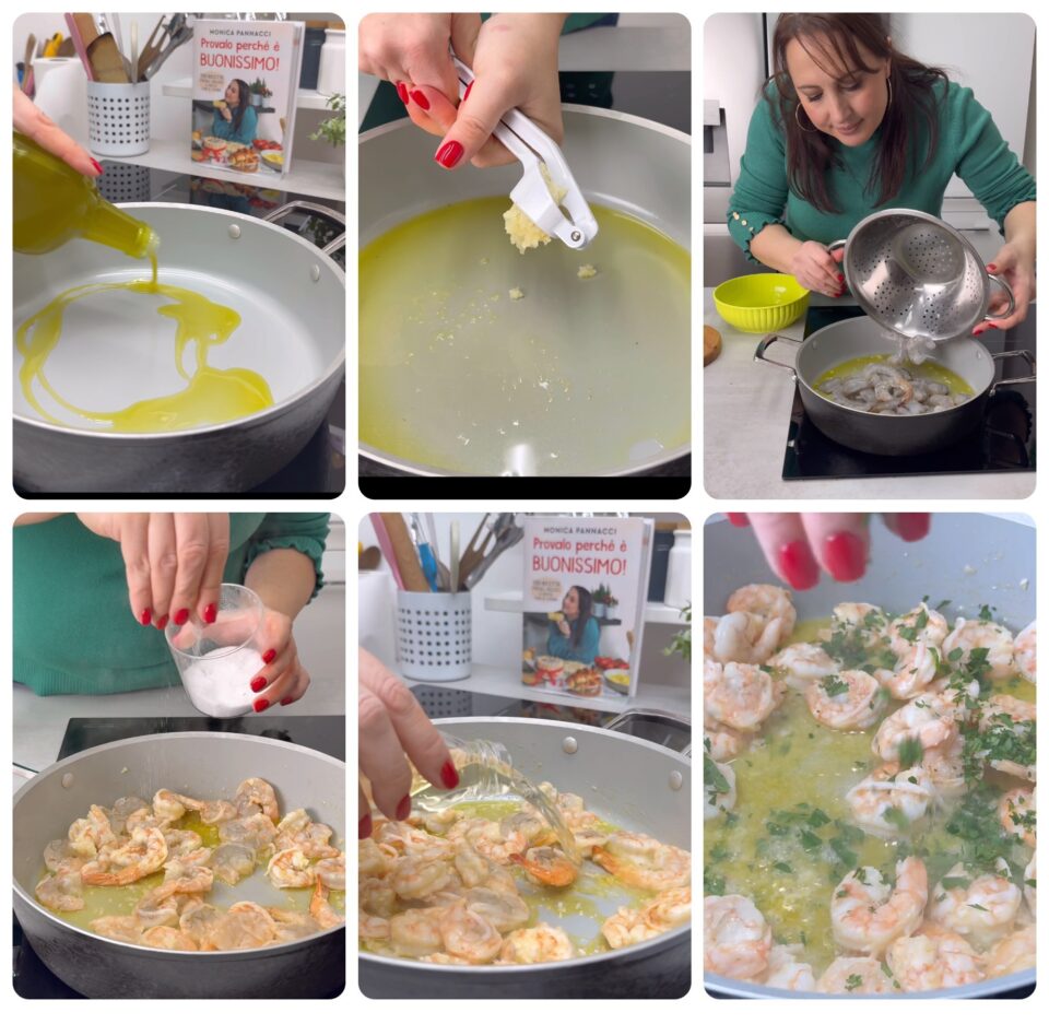 Mettete un bel goccio di olio sul fondo della casseruola insieme all’aglio schiacciato, fate insaporire e unite i gamberi. Regolate di sale, sfumate con il vino bianco, alzate la fiamma e quando non sentite più odore di alcool aggiungete un trito di prezzemolo. Ci vogliono 5 minuti in tutto.