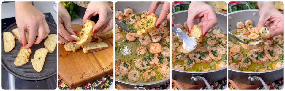 Potete accompagnare i gamberi all’aglio con del pane tostato e del formaggio spalmabile ottenendo così delle deliziose bruschette.