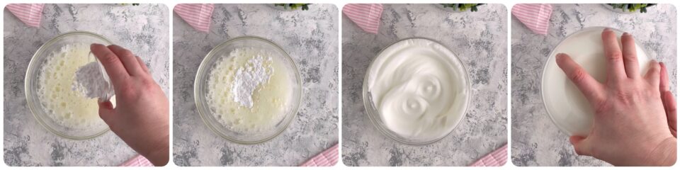 Quando gli albumi iniziano a diventare bianchi aggiungete lo zucchero a velo e montate a neve fermissima. Ciò significa che capovolgendo la ciotola gli albumi devono rimanere attaccati senza scivolare.