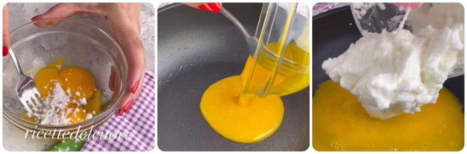 Sbattete i tuorli con 1/2 cucchiaino di zucchero a velo e versateli sul fondo di una padella antiaderente oliata e fate cuocere per 30 secondi quindi versate gli albumi.