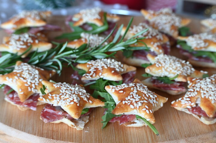 Quando preparo questi ANTIPASTI A FORMA DI STELLA DI PASTA SFOGLIA, so già che andranno a ruba. Sono uno di quegli antipasti furbi che fanno scena con pochissimo sforzo, perfetti per le feste, per un buffet tra amici, per l’aperitivo della domenica o per aprire un pranzo importante con qualcosa di bello e goloso. Le stelline di sfoglia sono dorate, friabili, profumate, con quel contrasto irresistibile tra il ripieno morbido e la superficie croccante ricoperta di sesamo.