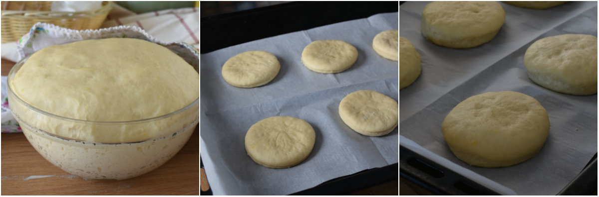 Trascorso il tempo, sgonfia delicatamente l’impasto e dividilo in 12–14 palline. Appiattiscile leggermente e farcisci il centro con un cucchiaio di crema pasticcera, cioccolato o marmellata. Chiudi bene i bordi per non far uscire il ripieno durante la cottura e disponile su una teglia foderata con carta forno, con la chiusura verso il basso.