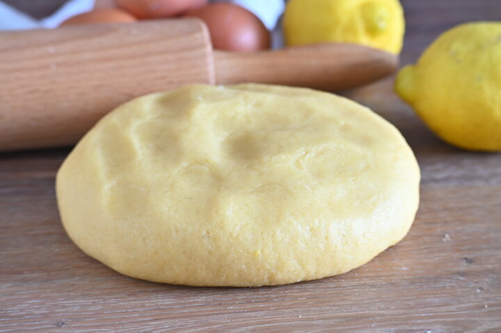 Poi prepariamo la PASTA FROLLA e lasciamola riposare in frigo per almeno 1 ora avvolta in pellicola trasparente prima di utilizzarla nella ricetta.