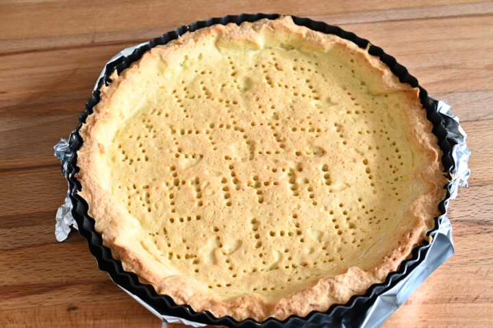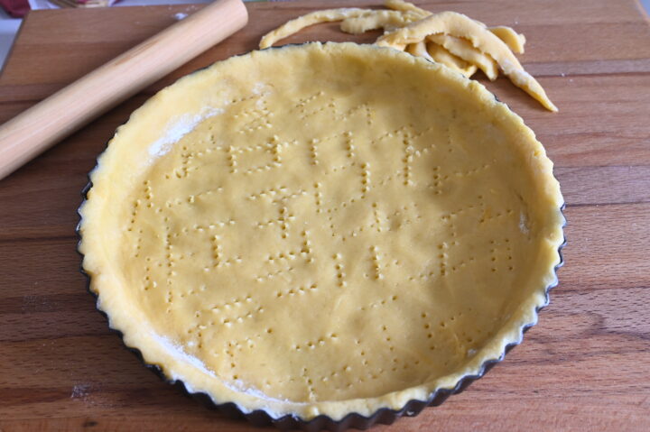 Foderiamo lo stampo eliminando gli eccessi d’impasto e bucherelliamo il fondo così non si alzerà in cottura.