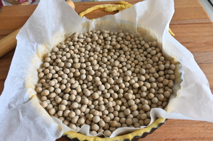 Aggiungiamo sopra un foglio di carta forno e dei fagioli o ceci o palline di ceramica per la cottura alla cieca.