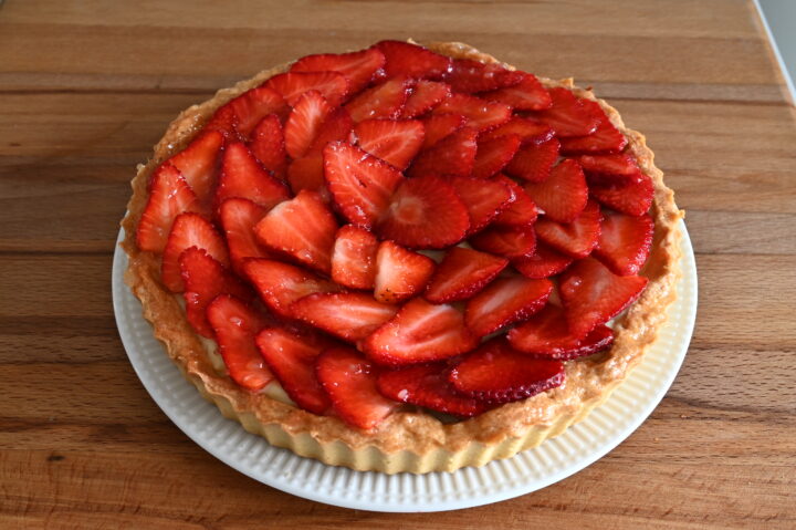 CROSTATA ALLE FRAGOLE E CREMA PASTICCERA è un dolce da forno semplice ma scenografico, composto da fragrante pasta frolla, vellutata crema pasticcera e fragole fresche di stagione. Una ricetta perfetta per la primavera e l’estate, ideale per feste, domeniche in famiglia o per chi vuole portare in tavola un dessert elegante senza difficoltà. Come la CROSTATA alla CREMA questa è quella che preparo spesso per la domenica, specie quando tornano le belle giornate e si può pranzare in giardino.