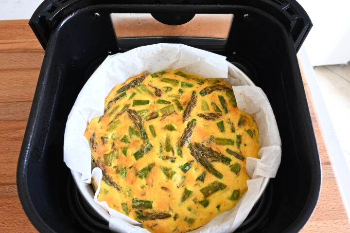 Molti si lamentano che la frittata al forno o in friggitrice diventi gommosa. Il segreto è la temperatura dolce. Non superate mai i 170°C! Una temperatura troppo alta farebbe gonfiare subito la frittata per poi farla sgonfiare e indurire. Cuocendola lentamente, le uova resteranno vellutate e gli asparagi rilasceranno il loro profumo senza bruciare.