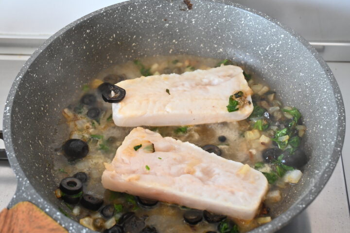 Quando il soffritto sarà rosolato uniamo i filetti di merluzzo surgelati e lasciamoli cuocere per 1 minuto a fiamma bassa.