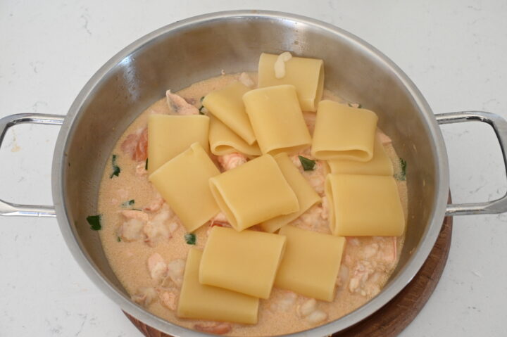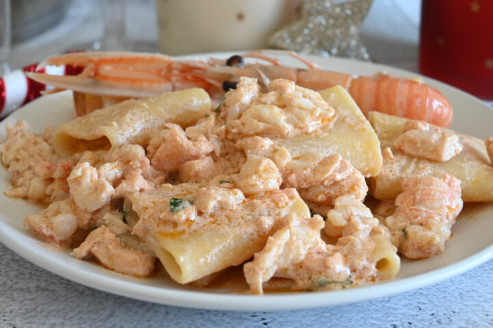 La pasta con crema di scampi è una ricetta classica della cucina italiana di mare, facile da preparare ma dall’aspetto raffinato. Io ho scelto i paccheri, che trattengono perfettamente il condimento, ma puoi usare anche tagliatelle o linguine. La base è una crema vellutata preparata con polpa di scampi, vino bianco, panna e concentrato di pomodoro, che dona un colore delicato e un sapore equilibrato tra mare e cremosità.