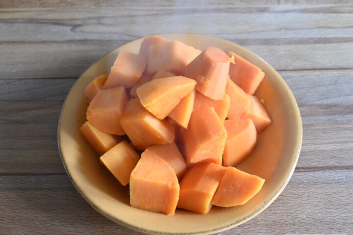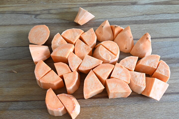 Sbucciamo le patate dolci e tagliamele in cubettoni medi.