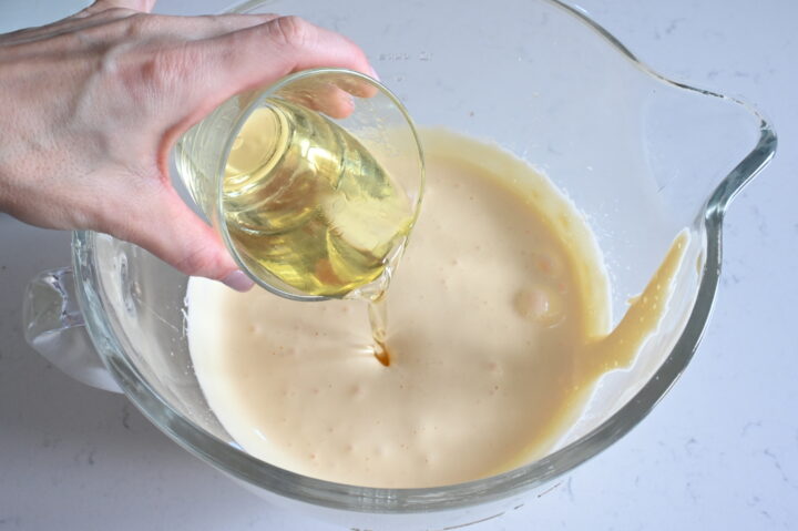 Trascorsi i primi tre minuti, abbassate la velocità delle fruste al minimo. Versate l’olio di semi di girasole a filo.