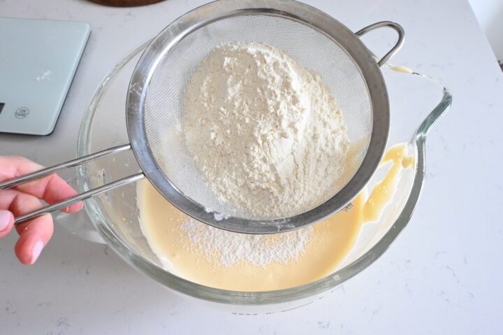Siamo arrivati agli ultimi 3 minuti. Spegnete le fruste e armatevi di una spatola (o marisa). Setacciate direttamente nella ciotola la farina 00, la fecola di patate e la bustina di lievito per dolci. Incorporate le polveri con movimenti lenti e circolari, dal basso verso l’alto, per non smontare tutta l’aria che abbiamo faticosamente incorporato all’inizio.