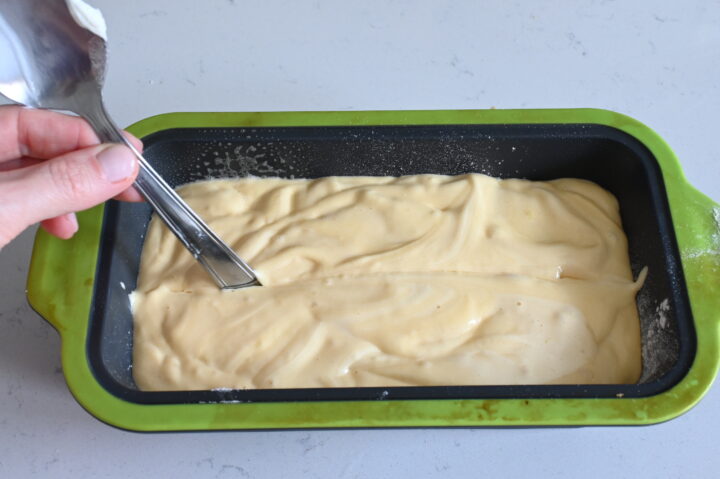 Versate l’impasto in uno stampo da plumcake (circa 25-28 cm) precedentemente imburrato e infarinato.