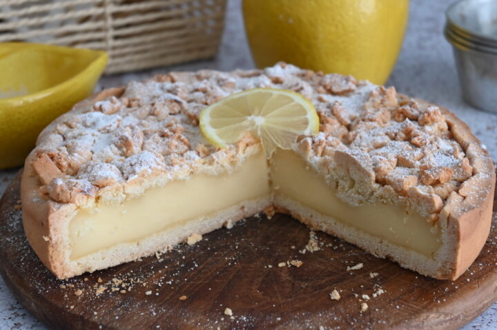 La crostata ricotta e limone facile è uno di quei dolci che preparo quando ho voglia di qualcosa di profumato, cremoso e allo stesso tempo semplice da realizzare. La base è una pasta frolla friabile, il ripieno è una crema morbida alla ricotta e limone, fresca e delicata, mentre sopra non ci sono le classiche strisce, ma un impasto sbriciolato che in cottura diventa dorato e irresistibile.