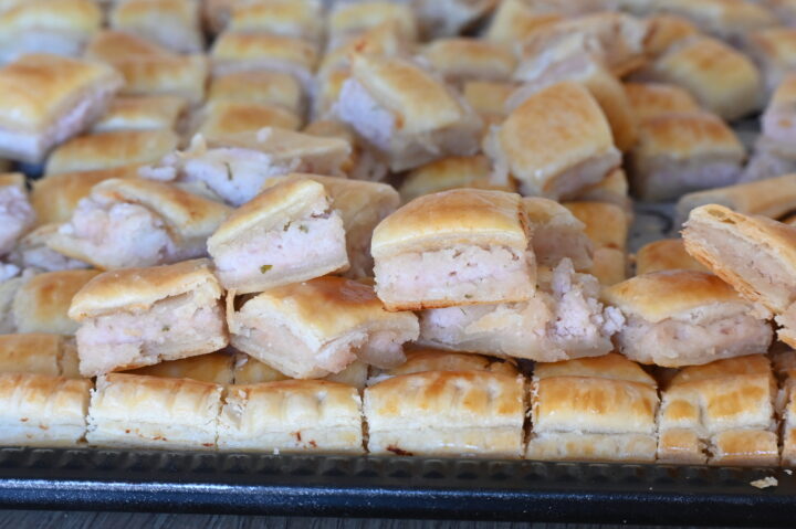 Quello che adoro di questa ricetta è la magia della cottura: due sfoglie rettangolari farcite con una crema al prosciutto cotto vengono incise prima di andare in forno, ma senza separare i quadratini. Durante la cottura la sfoglia si gonfia, diventa friabile e dorata, e una volta sfornata… basta seguire i tagli già fatti per ottenere tanti mini salatini perfettamente porzionati. Senza stress, senza doverli modellare uno a uno.