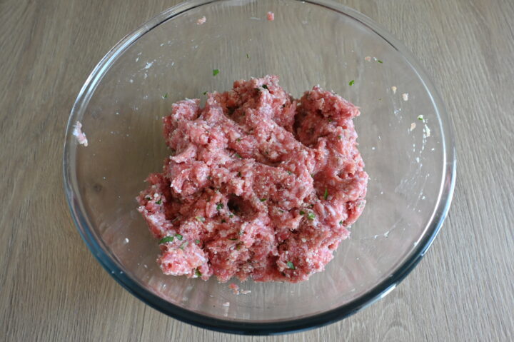 In una ciotola capiente unisco la carne macinata, l’ uova, parmigiano, prezzemolo (aglio tritato se vuoi).