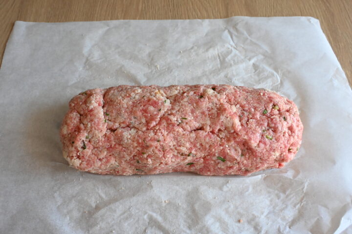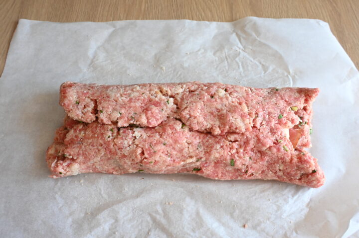 Realizzo su carta da forno un rettangolo di carne spesso 1 cm e 20×25.