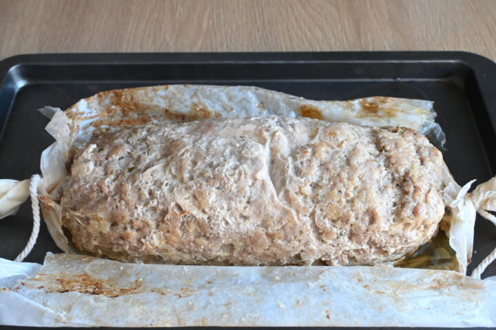 Adagio il polpettone in una teglia inforno in forno preriscaldato a 180°C per circa 45 minuti, poi apro la carta forno e negli ultimi 10 minuti aumento a 200°C per ottenere la classica crosticina dorata tipica della ricetta del polpettone tradizionale.