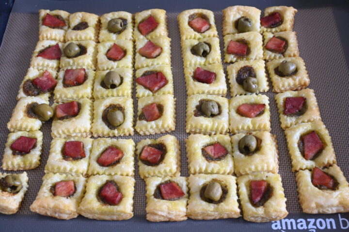 Si tratta di un rotolo di pasta sfoglia che viene tagliato in quadratini da circa 2–3 cm, farcito al centro con piccoli ingredienti golosi — un dadino di provola, un pezzetto di salume, un’oliva, oppure del salmone — e poi semplicemente infornato. Durante la cottura la sfoglia cresce, si gonfia, si separa naturalmente e crea questi bocconcini croccanti fuori e morbidi dentro, irresistibili uno dopo l’altro.