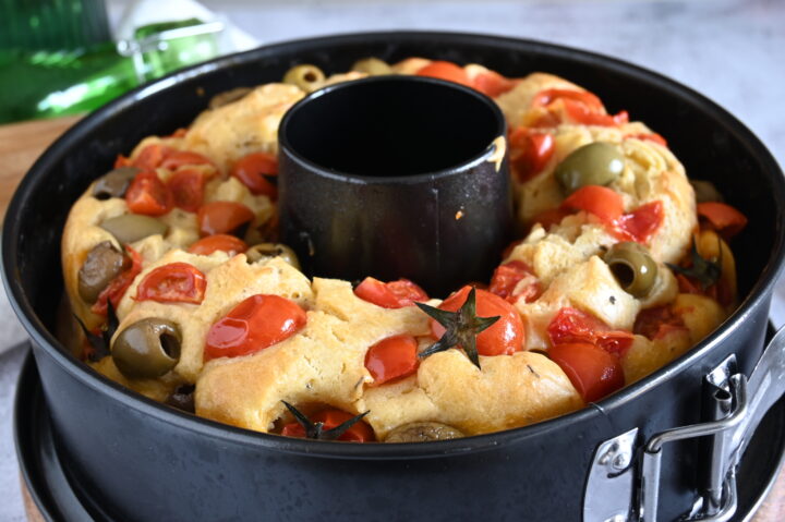 Cottura: Versa il composto in uno stampo (24 cm) imburrato e infarinato. Aggiungi sopra pomodorini, alcuni interi ed altri tagliati in spicchi ed olive. Inforna in forno statico a 180°C per circa 35-40 minuti. Fai la prova stecchino: deve uscire asciutto.