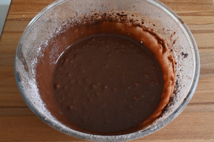 Setaccia la farina, il cacao ed il lievito ed unisci tutto al composto al cioccolato.