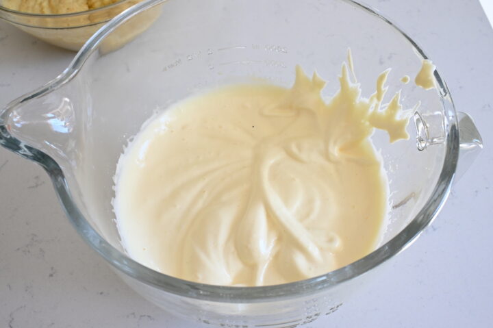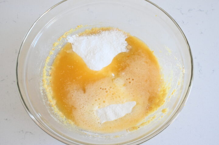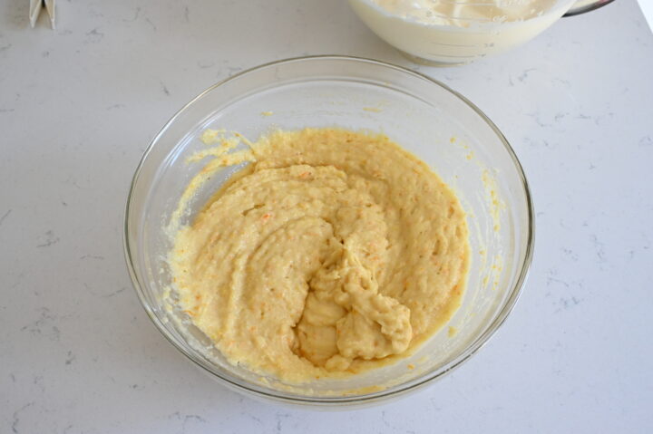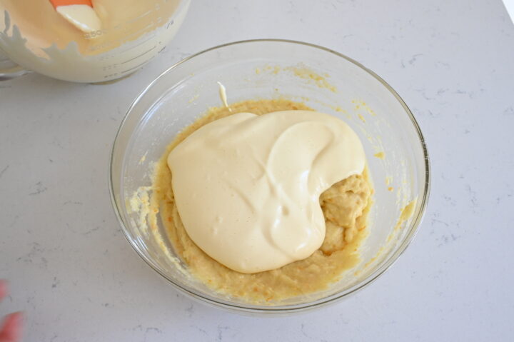 Aggiungo in due volte le uova e zucchero montati mescolando delicatamente con una spatola mantenendo l’impasto spumoso.
