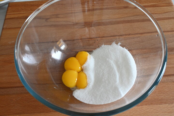 Separa tuorli ed albumi e monta questi ultimi a neve aggiungendo un pizzico di sale ed un cucchiaio di zucchero.