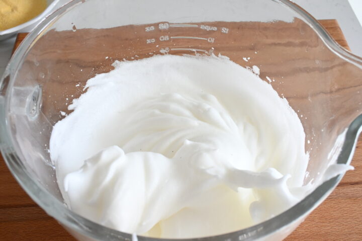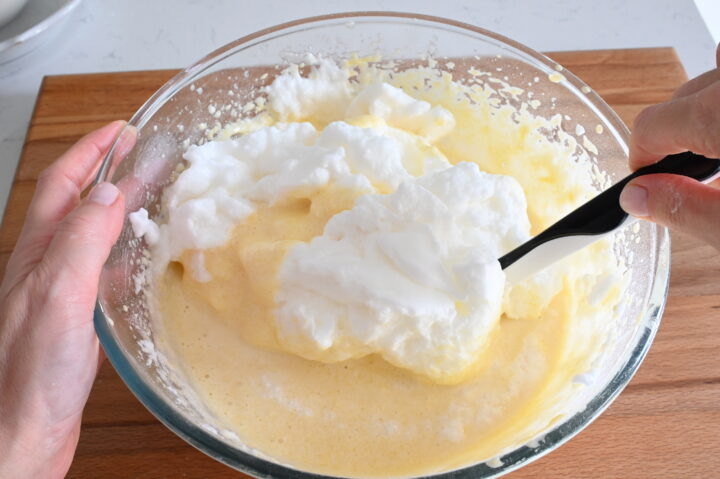 Aggiungi gli albumi mescolando delicatamente con una spatola dall’alto verso il basso senza smontare l’impasto.