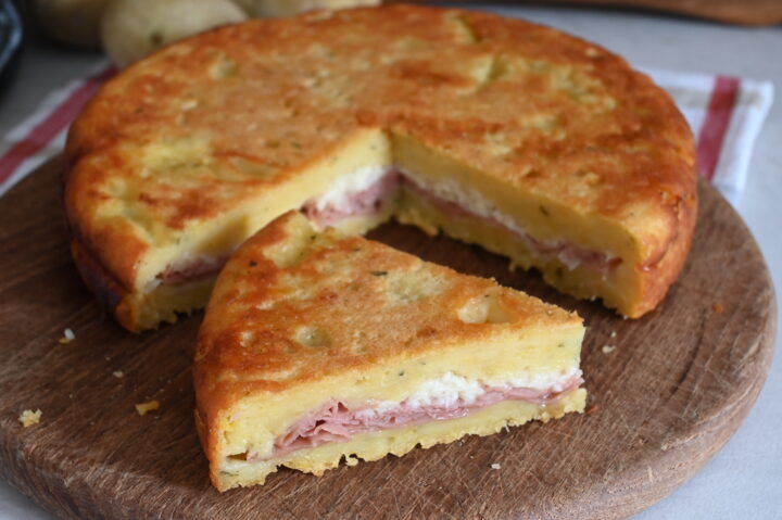 La base è fatta solo di patate schiacciate, morbide e saporite, arricchite con parmigiano e pangrattato, che in cottura diventano una crosta dorata e leggermente croccante. Dentro invece nascondo un cuore golosissimo di prosciutto cotto e formaggio filante che si scioglie al taglio creando quell’effetto “fila” irresistibile che fa venire l’acquolina solo a guardarlo.