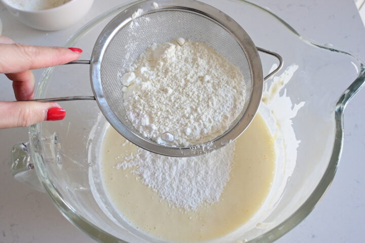 Mescoliamo farina, lievito e fecola insieme e poi aggiungiamo all’impasto le polveri setacciandole poco per volta. Montiamo sempre piano alla velocità più bassa.