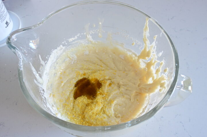 Aggiungiamo scorza di limone e vaniglia, mescoliamo per amalgamarle al resto.