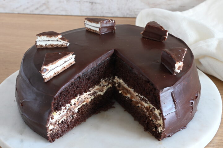 La Torta di Compleanno al gusto Pinguino è una ricetta alternativa alle solite torte che si preparano ed è la variante al forno della Cheesecake Pinguino che avete amato in tanti. Perfetta per questa occasione ed è adatta sia agli adulti che ai bambini. È facilissima da preparare, ve lo garantisco perché ho inserito anche il video dei passaggi in modo tale che vi risulterà semplicissima. Se volete fare bella figura e preparare un dolce perfetto per il compleanno ma per un’occasione speciale allora vi consiglio questa ricetta. Si tratta di una torta al cioccolato molto soffice simile ad un Pan di Spagna ma molto veloce da preparare ed una farcitura con uno strato di crema al mascarpone ed uno di ganache al cioccolato fatta semplicemente con cioccolato fondente e latte che ho utilizzato anche per la copertura. In più, come decorazione ho messo dei pezzetti di kinder pingui per dare una migliore idea del dolce. Non ci resta che metterci a lavoro!