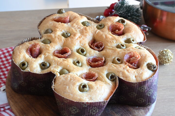 L’impasto è volutamente molle e cremoso, così da cuocere diventando soffice come una nuvola. All’interno si nascondono dadini di provola filante, olive saporite e cubetti di salame, che rendono ogni morso ricco e irresistibile. La superficie è uno spettacolo a sé: piccole rose di salame, che in cottura diventano leggermente croccanti e profumate, perfette per l’atmosfera natalizia.
