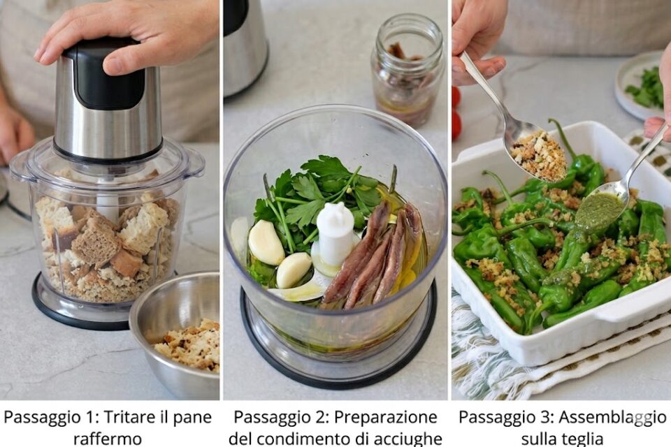 Come cucinare i friggitelli ammolicati alla napoletana in meno di 15 minuti: questa ricetta veloce, saporita e genuina trasforma i friggitelli in un contorno irresistibile grazie a un mix croccante di pane raffermo sbriciolato, alici, aglio, prezzemolo e olio extravergine d’oliva, arricchito da pomodorini succosi e olive nere, da cuocere comodamente in friggitrice ad aria o in forno ventilato per ottenere leggerezza e massima croccantezza con poco condimento e in poco tempo.