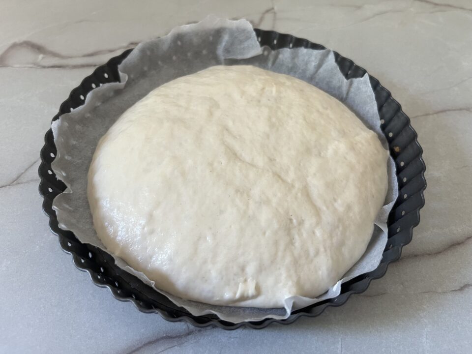 Ungi abbondantemente una teglia d 32 tonda con olio extravergine, o rivesti con carta forno versa l’impasto direttamente nella teglia e, con le dita ben oliate, stendilo delicatamente dal centro verso i bordi senza sgonfiarlo; se tende a ritirarsi, aspetta 10 minuti e riprendi a stenderlo. Nel frattempo taglia i pomodorini, precedentemente lavati, a metà, e condiscili con un pizzico di sale.