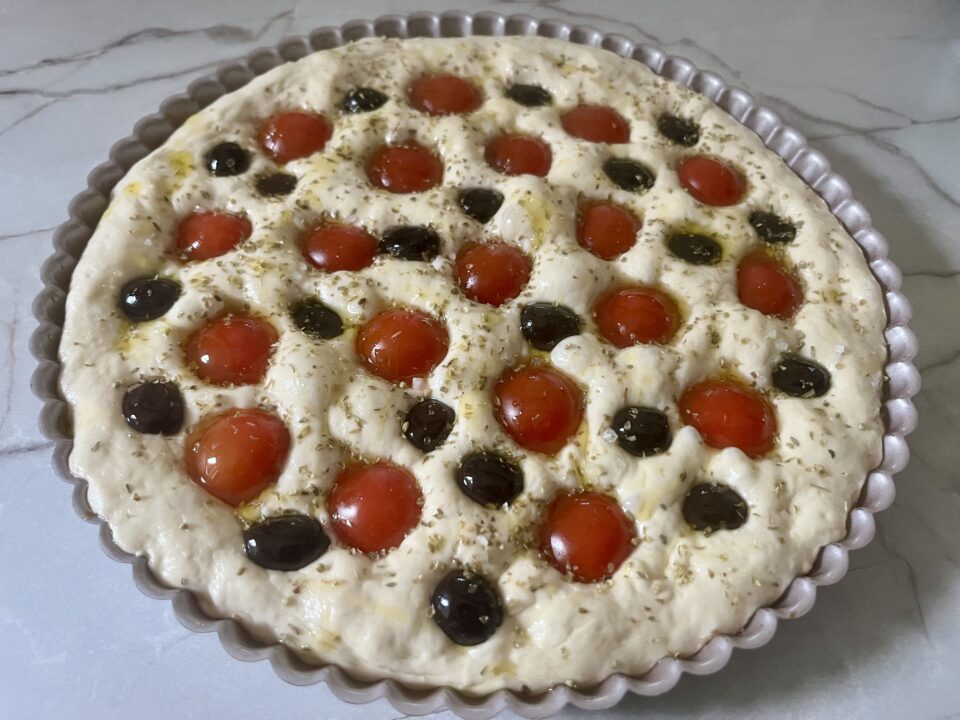 Dopo il riposo, premi nuovamente l’impasto con i polpastrelli formando i classici buchi della focaccia, distribuisci sopra i pomodorini schiacciandoli leggermente affinché rilascino il succo, aggiungi olive nere, origano, sale grosso.