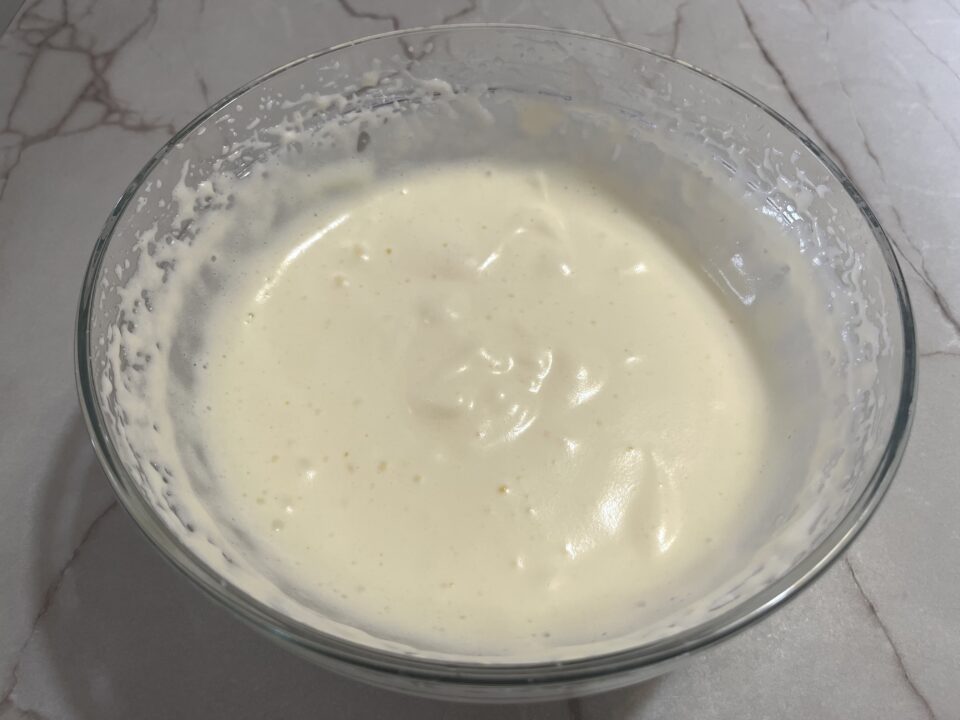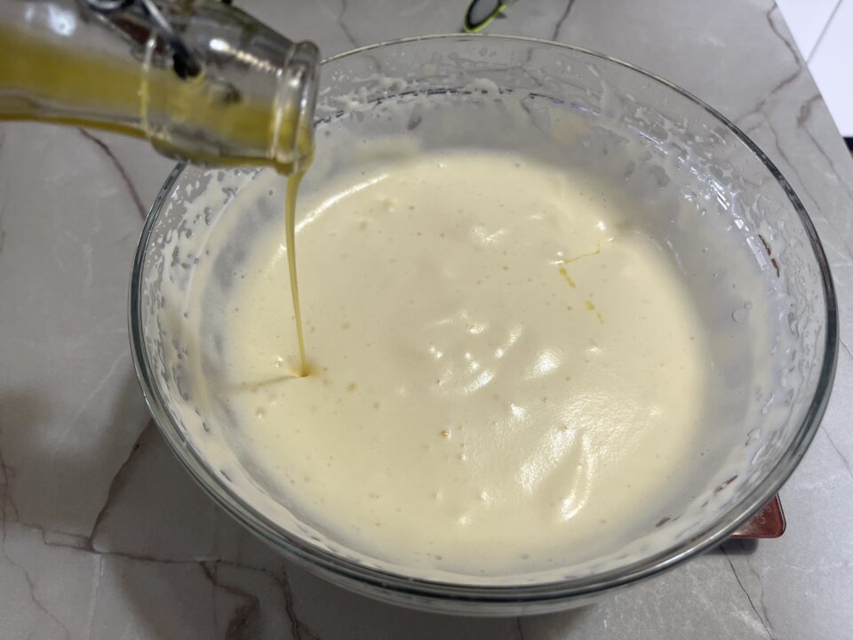 poi versa l’olio di oliva a filo. Mescola bene fino a ottenere un composto liscio e omogeneo: lo yogurt darà morbidezza, mentre l’olio renderà il dolce più leggero e delicato rispetto al burro.