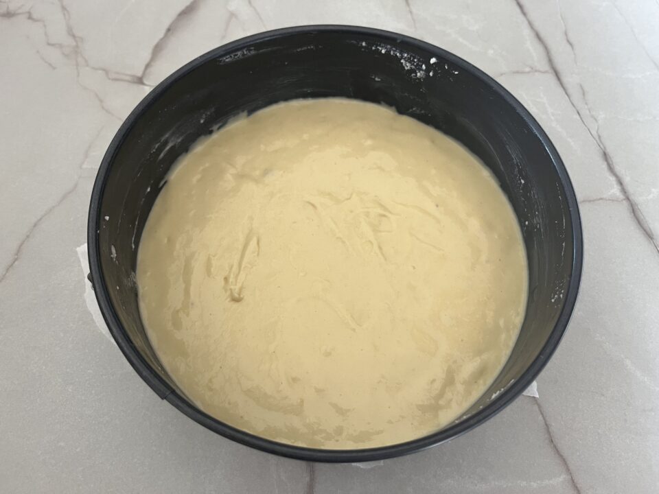 Ungi leggermente uno stampo d 20 con olio di oliva e infarinalo, oppure rivestilo con carta forno. Versa l’impasto livellandolo bene