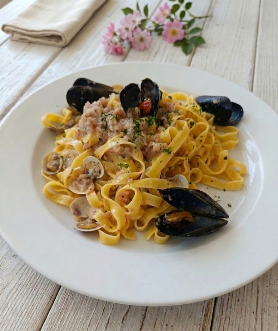 In un’altra padella fare scaldare l’olio extravergine d’oliva con uno spicchio d’aglio e poi unire il trito di calamari e gamberi. Sfumare con vino bianco, salare a piacere e fare cuocere per 5 minuti. Poi unire le cozze, le vongole e il sughetto filtrato. Fare cuocere per altri 2 minuti.