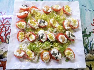 Pomodorini in festa finger food.Con l’arrivo della bella stagione, ci vien voglia di cibi leggeri e gustosi, e anche molto colorati.Il piatto che vi presento oggi, è facilissimo da fare, molto economico e potrai servirlo come aperitivo, antipasto o come secondo piatto.Io li ho decorati con anacardi semi di girasole e farina di pistacchi, ma […]
